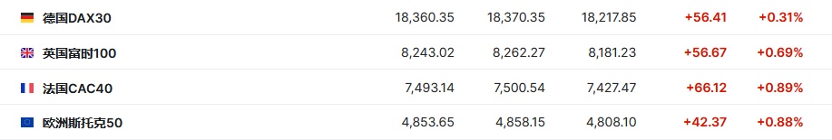 2. 截至发稿,德国DAX指数涨0.31%,英国富时100指数涨0.69%,法国CAC40指数涨0.89%,欧洲斯托克50指数涨0.88%。