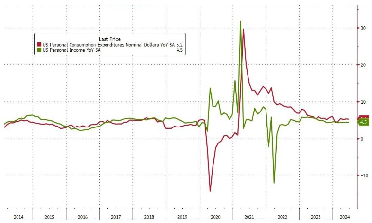 尽管如此,劳动力市场降温的迹象开始转化为购买力下降。6月份工资和薪水增长0.3%,是前一个月增长速度的一半。个人收入仅增长0.2%,低于0.4%的预期。在通胀调整的基础上,可支配收入增长放缓至0.1%。
