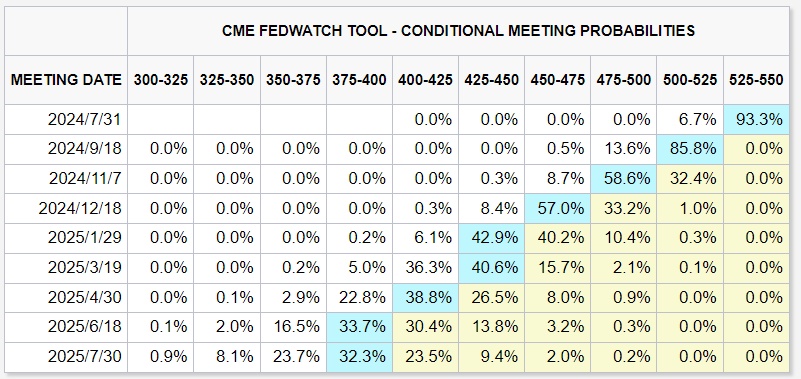 市场仍普遍预期美联储官员将在下周的会议上维持基准利率在20年高位不变,但投资者押注首次降息将在9月举行。根据CME美联储观察工具,期货市场反映出9月份降息的可能性约为86%,随后在11月和12月的FOMC会议上都将降息。不过,美联储官员在言论中一直保持谨慎,并强调没有既定的政策路径,由数据指引。