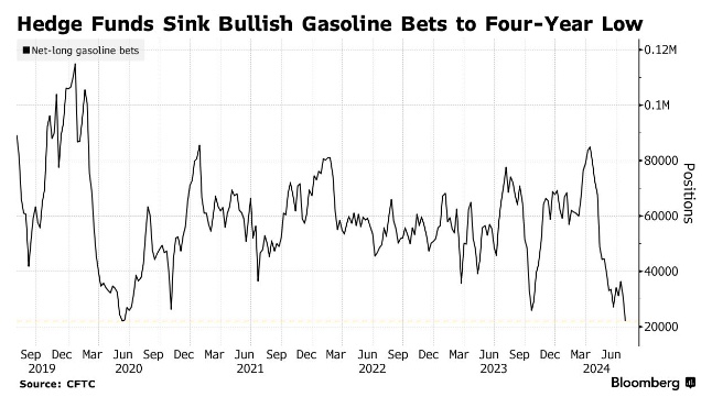根据美国商品期货交易委员会的数据,截至7月23日当周,基金经理在汽油期货的净多头头寸减少了9001手,至22158手,这是四年来的最低水平,与夏季旅行期间汽油需求加速的传统季节性模式相反。这些基金持有约七年来最大的空头头寸。