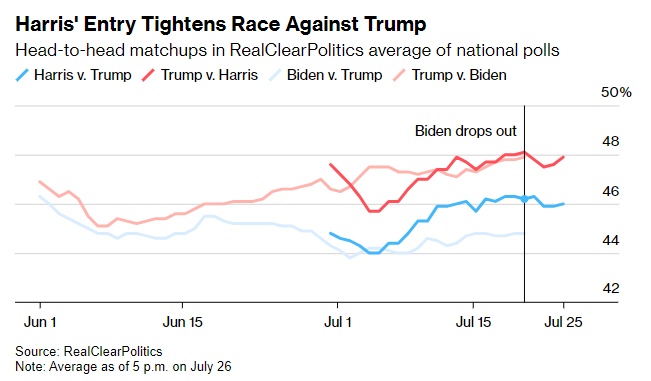 在过去一个月的民调中,特朗普(在上周的大会上正式成为共和党总统候选人)的支持率也发生了很大变化。自7月13日暗杀未遂以来,他的支持率有所上升,但拜登退出竞选的决定令这名候选人在接受党内提名后所期待的党代会后“反弹”黯然失色。
