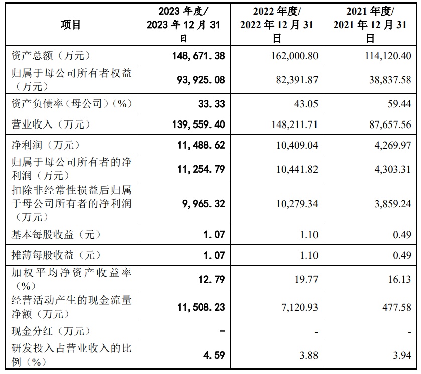 财务方面,于2021年、2022年及2023年,鹰峰电子实现营业收入分别约为8.77亿元、14.82亿元、13.96亿元,同期,该公司实现净利润分别为4269.97万元、1.04亿元、1.15亿元。