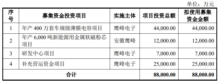 据了解,鹰峰电子本次发行的募集资金扣除发行费用后,将投资于以下项目: