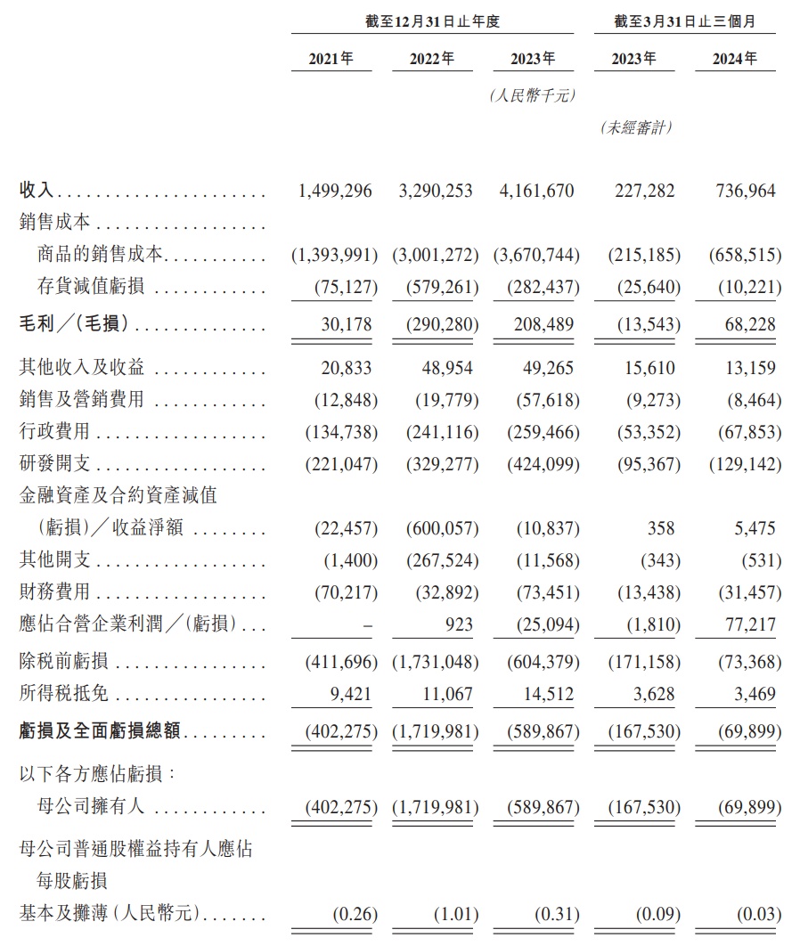 财务方面,截至2021年、2022年、2023年及2024年3月31日,公司实现收入分别为14.99亿元、32.90亿元、41.62亿元及7.37亿元人民币。同期,实现毛利分别为3017.8万元、-2.90亿元、2.08亿元及6822.8万元人民币。