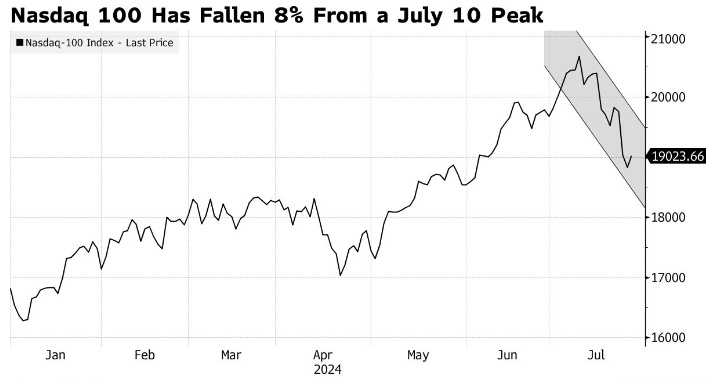 在一些价格最高的人工智能股票中,大抛售正在加剧:英伟达(NVDA.US)是该行业的领军企业,自6月18日超越微软和苹果成为全球市值最高的公司以来,该公司的市值已从历史高点下跌了17%;生产数据中心用服务器的戴尔科技公司(DELL.US)股价较5月份的峰值下跌了37%,其竞争对手超微型电脑(SMCI.US)自3月份以来下跌了40%。
