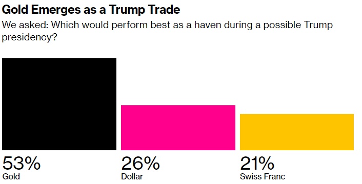 智通财经获悉,根据最新MLIV Pulse调查,如果特朗普再次赢得大选,黄金是最好的对冲投资组合。在480名受访者中,支持在特朗普连任的情况下将黄金作为避险工具的人比支持美元的人多一倍。超过60%的受访者认为,如果特朗普赢得连任,美元最终会走弱。