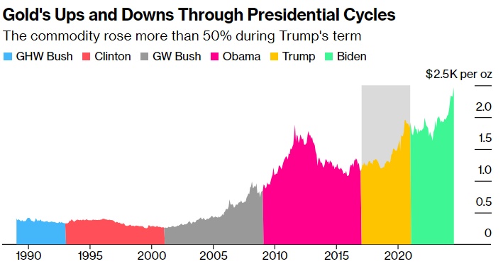 历史数据也支持了调查显示的观点。在特朗普执政的四年里,彭博美元指数下跌了10%以上,而黄金现货价格上涨了50%以上。特朗普的减税、关税和放松监管的政纲被华尔街视为通胀政策,甚至可能迫使美联储再次加息。11月共和党控制美国国会的“红色浪潮”将使特朗普在制定全面经济政策方面有更大的回旋余地,可能会进一步点燃贵金属,目前金价徘徊在历史高点附近。