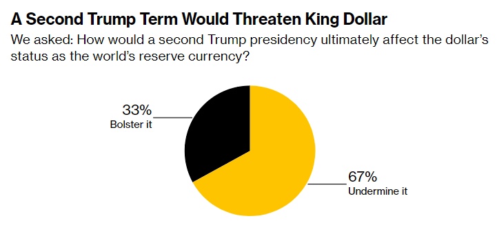 MLIV Pulse的受访者对特朗普经济政策对美元的影响看法不一。一位受访者认为,无论选举结果如何,美元都会走弱:“持续的高赤字和低利率将进一步推动去美元化,并引发主权债务危机。哈里斯赢了也一样。”