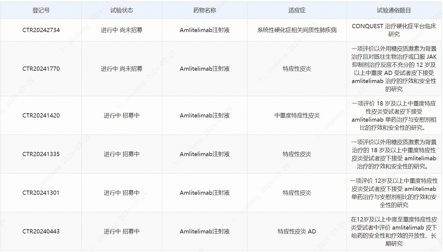 根据中国药物临床试验登记与信息公示平台,amlitelimab正在中国开展多项用于治疗特应性皮炎的临床研究,以及一项用于治疗系统性硬化症相关间质性肺疾病的临床试验。