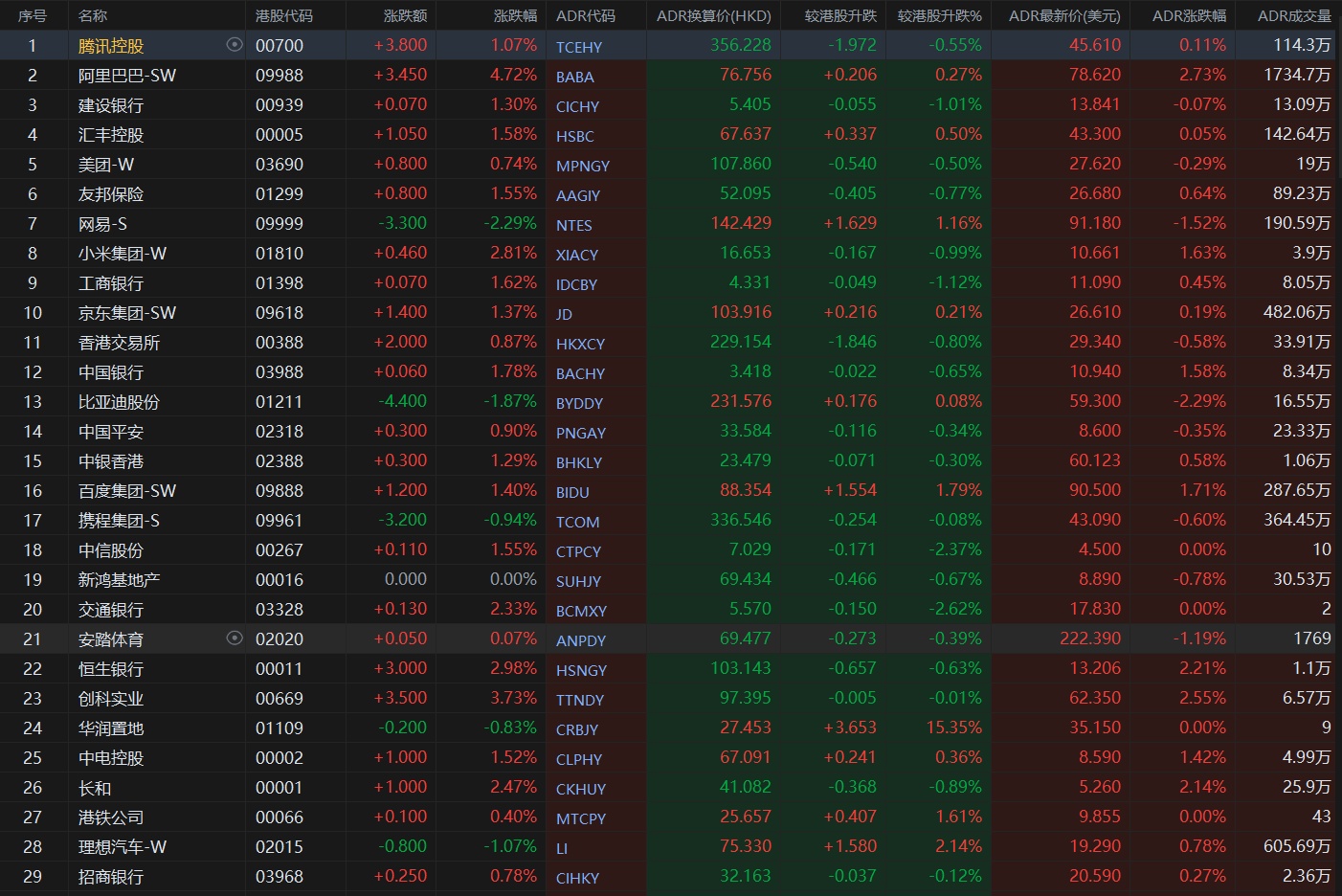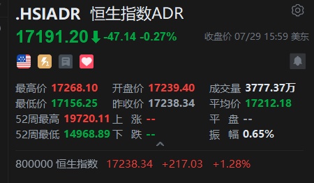 智通财经APP获悉,周一美股三大指数涨跌不一,恒生指数ADR下跌,按比例计算,收报17191.20点,较香港收市下跌47.14点或0.27%。