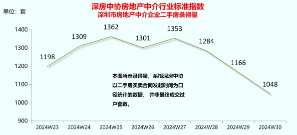 智通财经APP获悉,7月30日,经深房中协统计,2024年第30周全市二手房(含自助)录得1048套,环比下降10.1%。随着前期楼市优化政策对潜在需求的不断消化后,同时叠加楼市进入传统淡季月份,二手房市场交易量持续下降。7月22日房贷利率再次下调是否产生效应还需后续持续观察。