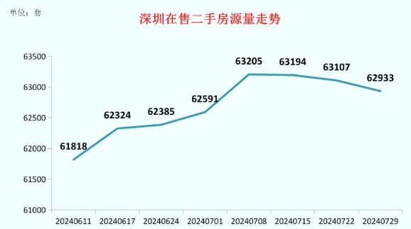 根据公开在售二手房源量数据统计,2024年7月29日,全市共有62,933套有效二手房源在售,较上周减少174套,持续小幅下滑。其中罗湖较上周减少65套,有效在售8,216套,南山较上周减少48套,有效在售10,783套,宝安较上周减少25套,有效在售11,219套。