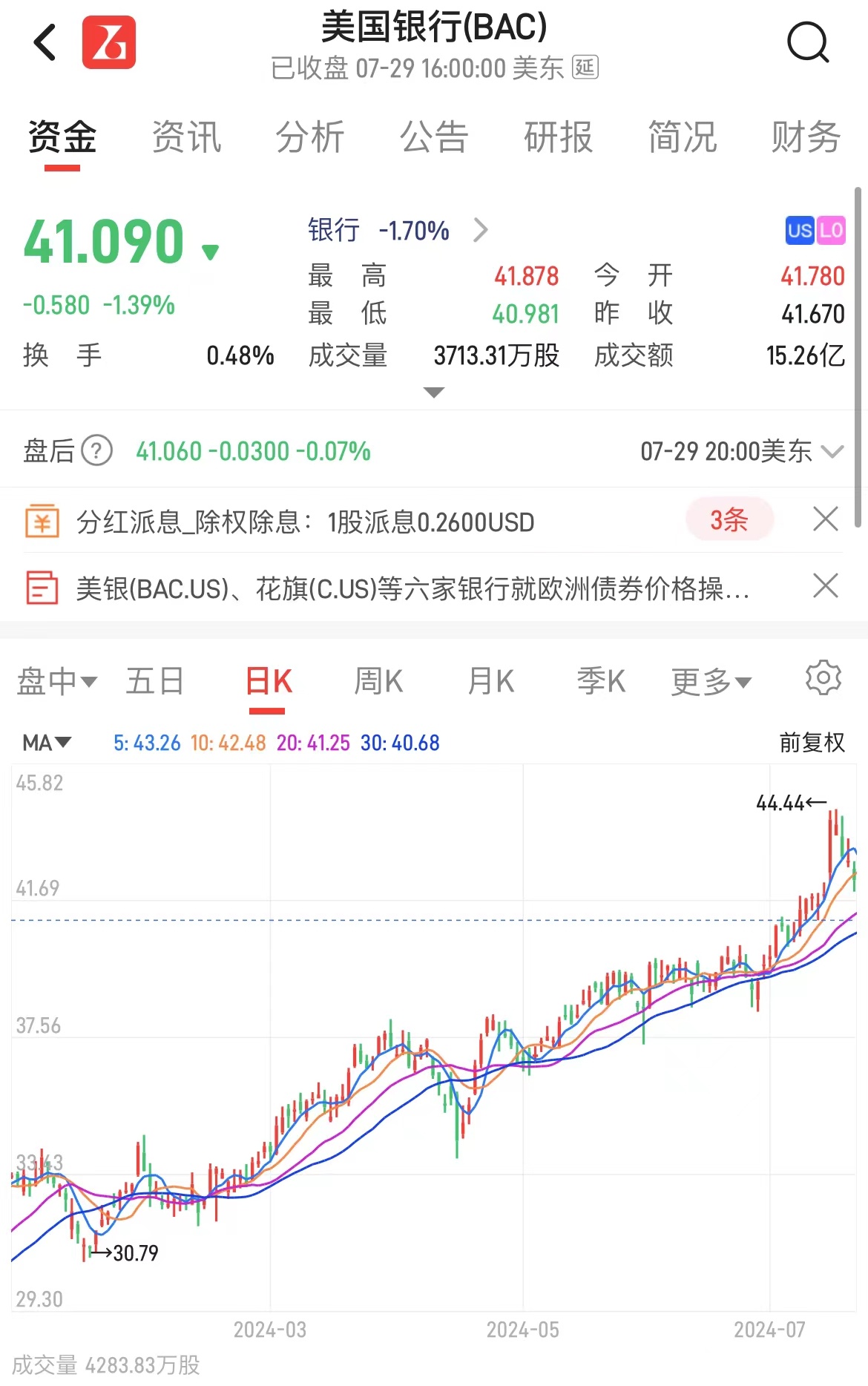 智通财经获悉,当地时间周一,沃伦•巴菲特旗下伯克希尔哈撒韦公司(BRK.A.US)披露了本月第三次出售美国银行(BAC.US)股票的消息,将其在这家银行的巨额持仓总计削减了30多亿美元。周一提交给监管机构的文件显示,该公司在7月25日至7月29日期间出售了7.67亿美元的美国银行股票。