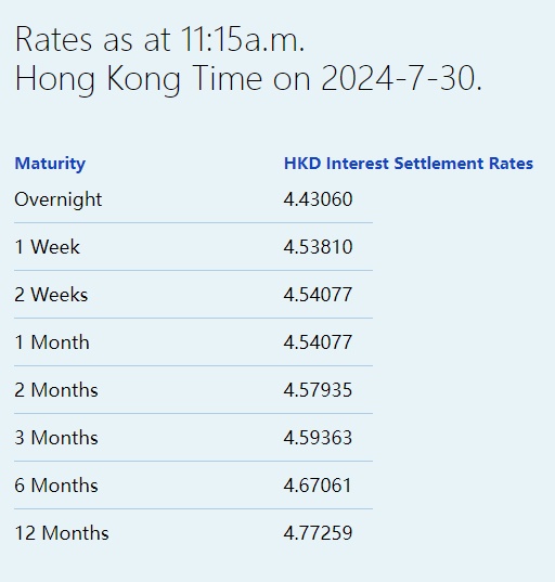 智通财经APP获悉,7月30日,港元拆息全线下跌,隔夜拆息下跌约4.8基点,报4.4306%,连跌四日,为7月11日以来最低。与楼按相关的一个月拆息亦跌约4.5基点至4.54077%,为7月5日以来最低。