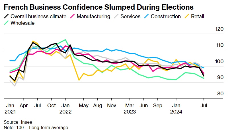 不过值得注意的是,法国第二季度的GDP数据仅部分反映了马克龙6月9日宣布的提前选举带来的影响,此时距离第二季度结束还有大约三周。自那以来,一些先行指标显示出法国商业不确定性激增,因为企业们担心新政府是否会大幅增加劳动力成本和税收规模。