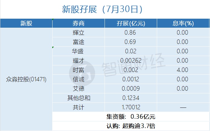 等券商合计为众淼控股借出1.70012亿港元,超购逾3.7倍。