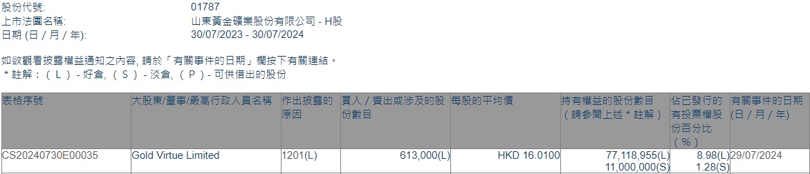 Limited减持山东黄金(01787)61.3万股,每股作价16.01港元,总金额为981.413万港元。减持后最新持股数目约为7711.9万股,持股比例为8.98%。