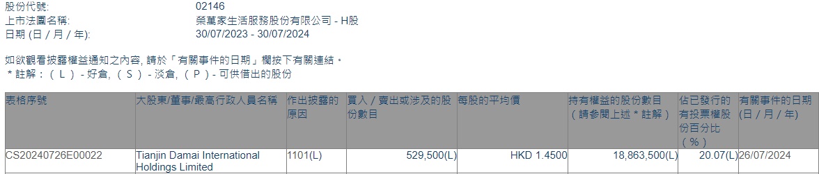 Limited增持荣万家(02146)52.95万股,每股作价1.45港元,成交额约76.78万港元。增持后最新持股数目为1886.35万股,持股比例为20.07%。