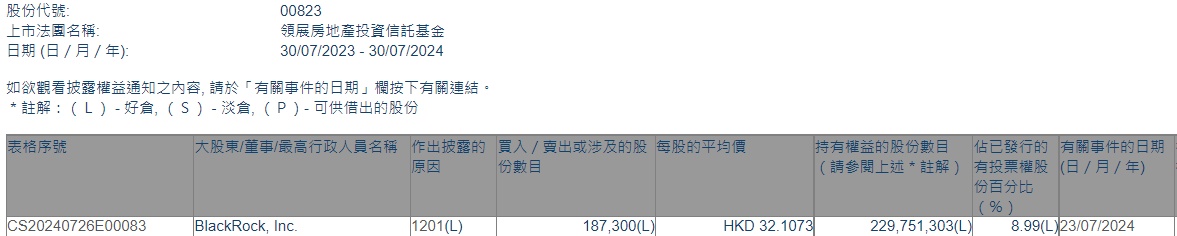 智通财经APP获悉,据香港联交所最新数据显示,7月23日,贝莱德减持领展房产基金(00823)18.73万股,每股作价32.1073港元,总金额约为601.37万港元。减持后最新持股数目约为2.30亿股,持股比例为8.99%。