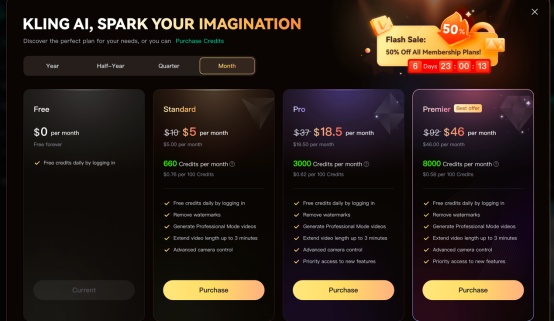 可灵AI还同步对全球会员推出了「5折」优惠活动,限时一周。其中,黄金会员(Standard)最低价仅每月5美元;铂金会员(Pro)、钻石会员(Premier)每月分别低至18.5美元和46美元。