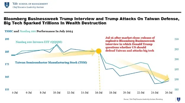 例如,本月中旬,特朗普曾表示中国台湾要给美国付“保护费”,以及其团队人员要求台湾提高军费。此话一出,台积电(TSM.US)股价应声下挫约15%。在同一次采访中,特朗普还积极地瞄准了美国大型科技公司,加剧了科技股的抛售,纳斯达克100指数在几天后下跌了近10%,蒸发了超过1.7万亿美元的财富。