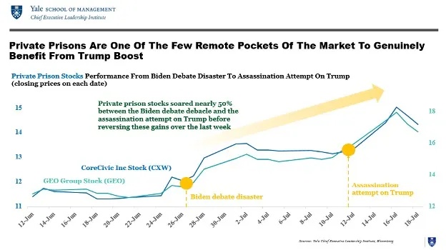 特朗普风暴造成的市场价值损失,远高于少数几个从特朗普获胜前景中受益的孤立市场带来的增益,这些市场被一些人称为“特朗普贸易”——在拜登政府下受到严格监管的行业,如私人监狱、掠夺性贷款机构和枪支制造商。无论如何,在拜登的辩论灾难和特朗普被暗杀之后的几天里,这些行业的最初涨幅在过去几周基本上被逆转了。
