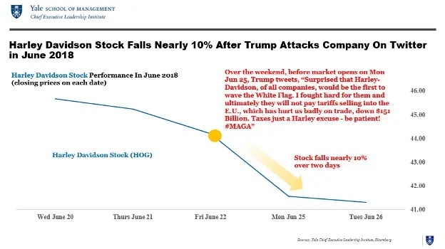 例如,2018年6月,在特朗普突然发推文威胁要对哈雷戴维森(HOG.US)增加所谓的外包税(后来被证明是不真实的)后,哈雷戴维森股价在两天内下跌了近10%。