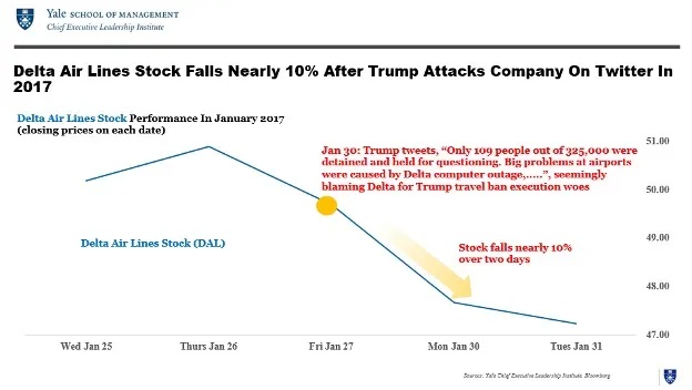同样,在他的第一个任期开始的几天里,达美航空公司(DAL.US)的股票在两天内下跌了近10%,因为特朗普在推特上发表了奇怪的推文,暗示该航空公司应对特朗普旅行禁令的拙劣执行以及由此导致的机场长时间延误负责。