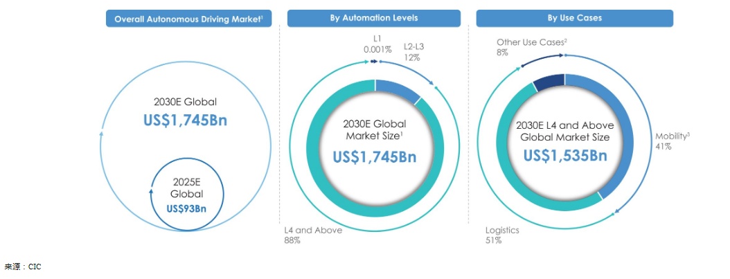据灼识咨询披露,未来十年,L4及以上的自主驾驶技术将通过机器出租车、机器客车、城市内和城市间机器人后勤车辆、机器人车辆、其他工业和城市服务车辆及其他客车实现商业化。到2030年,L4级及以上自动驾驶用例的商业化预计在全球范围内将达到15,350亿美元,2022年至2030年的复合年增长率为151%。