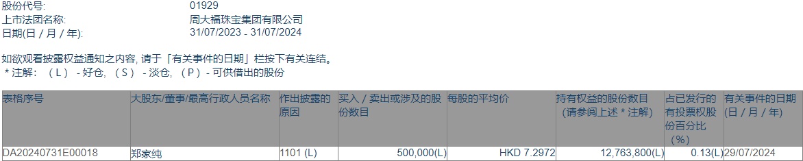 智通财经APP获悉,据香港联交所最新数据显示,7月29日,主席兼执行董事郑家纯增持周大福(01929)50万股,每股作价7.2972港元,总金额364.86万港元。增持后最新持股数目为1276.38万股,持股比例为0.13%。