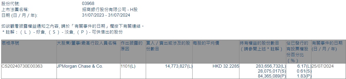 智通财经APP获悉,香港联交所最新资料显示,7月25日,小摩增持招商银行(03968)1477.3827万股,每股作价32.2285港元,总金额约为4.76亿港元。增持后最新持股数目约为2.84亿股,持股比例为6.17%。