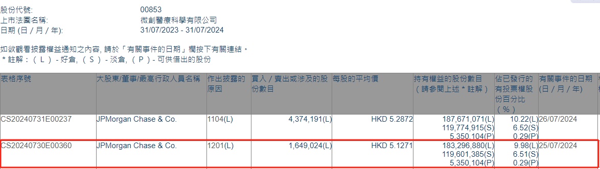 智通财经APP获悉,香港联交所最新资料显示,7月25日,小摩减持微创医疗(00853)164.9024万股,每股作价5.1271港元,总金额约为845.47万港元。减持后最新持股数目约为1.83亿股,最新持股比例为9.98%。