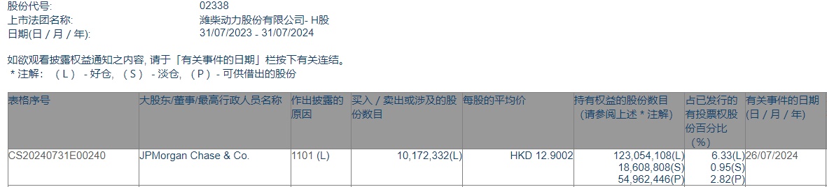 智通财经APP获悉,据香港联交所最新数据显示,7月26日,摩根大通增持潍柴动力(02338)1017.2332万股,每股作价约12.9港元,总金额约为1.31亿港元。增持后最新持股数目约为1.23亿股,持股比例为6.33%。