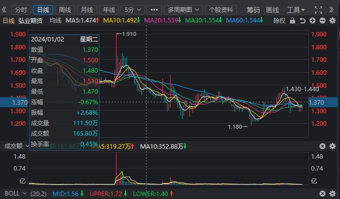 7月31日,港股多元金融板块狂飙,近期处于“多事之秋”的弘业期货(03678)亦暴力拉升,盘中涨幅一度突破66%,收盘报1.88港元/股,涨幅为57.98%,成交额约为3.37亿港元,总市值约为18.95亿港元。