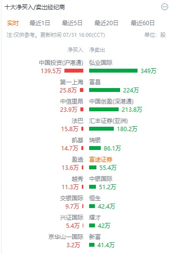 数据显示,7月31日,弘业期货获中国投资(沪港通)买入139.5万股,为第一大买入者;第一上海和中信里昂分别买入25.8万股及23.9万股,各列入第二、三大买入者席位。有买就有卖,卖方席位来看,弘业国际为最大卖出者,当日共计卖出349万股;富昌和中国创盈(深港通)为第二、三大卖方,分别卖出224万股、213.8万股。由此可见,买方席位的量较小,散户居多,而卖方量大,尤其是弘业期货自己出货量排在首位。