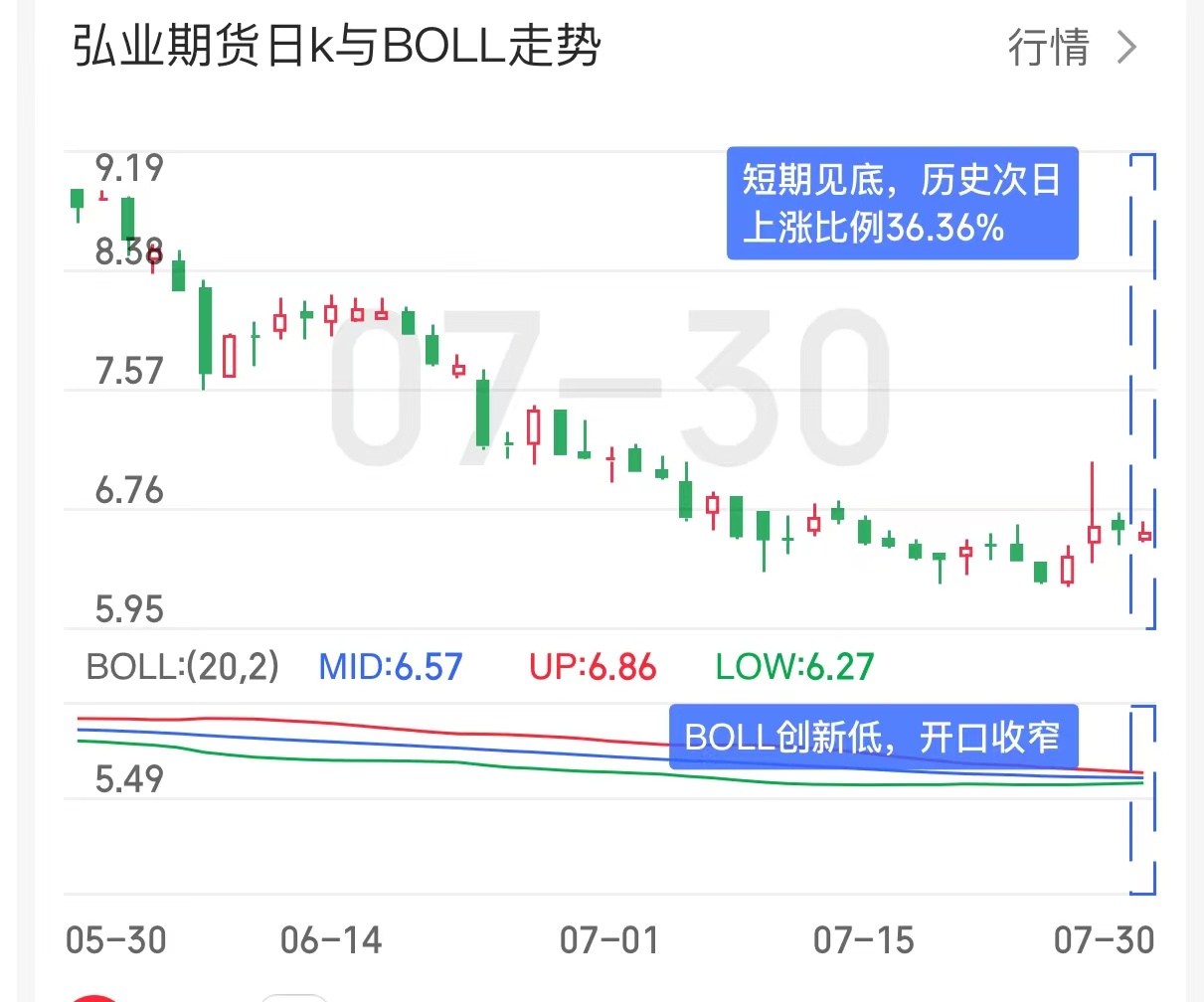 首先,弘业期货的布林线(BOLL)值于7月30日创下阶段新低,同时开口收窄,意味着股价波动幅度减少,多空方力量趋于一直,市场可能即将选择新的趋势方向。而自2022年开始,弘业期货共出现过11次BOLL创下阶段新低,同时开口收窄现象。根据历史数据可知,出现该现象1日后和5日后均可能出现上涨现象。