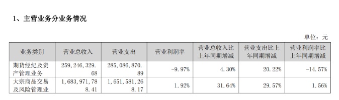 从主营业务情况来看,公司在期货经纪及资产管理业务方面,2023年弘业期货该业务营业总收入为2.59亿元,营业支出为2.85亿元,营业利润率为-9.97%,营业利润率比上年同期下滑14.57%;大宗商品交易及风险管理业务方面,2023年弘业期货该业务营业总收入为16.84亿元,营业支出为16.52亿元,营业利润率为1.92%,营业利润率比上年同期增长1.56%。