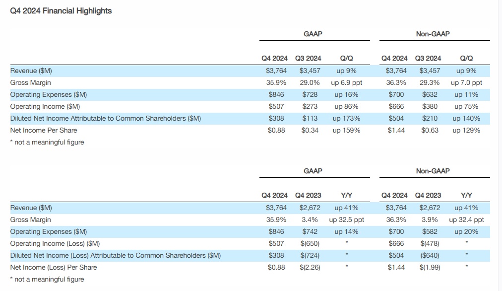 2024财年全年营收为130.03亿美元,同比增长6%。Non-GAAP会计准则下,营业利润为5.12亿美元,2023财年营业亏损为5.94亿美元;归属于普通股股东的净亏损为6500万美元,较2023财年的净亏损11.33亿美元大幅收窄。调整后的每股亏损为0.20美元,2023财年每股亏损3.56美元。