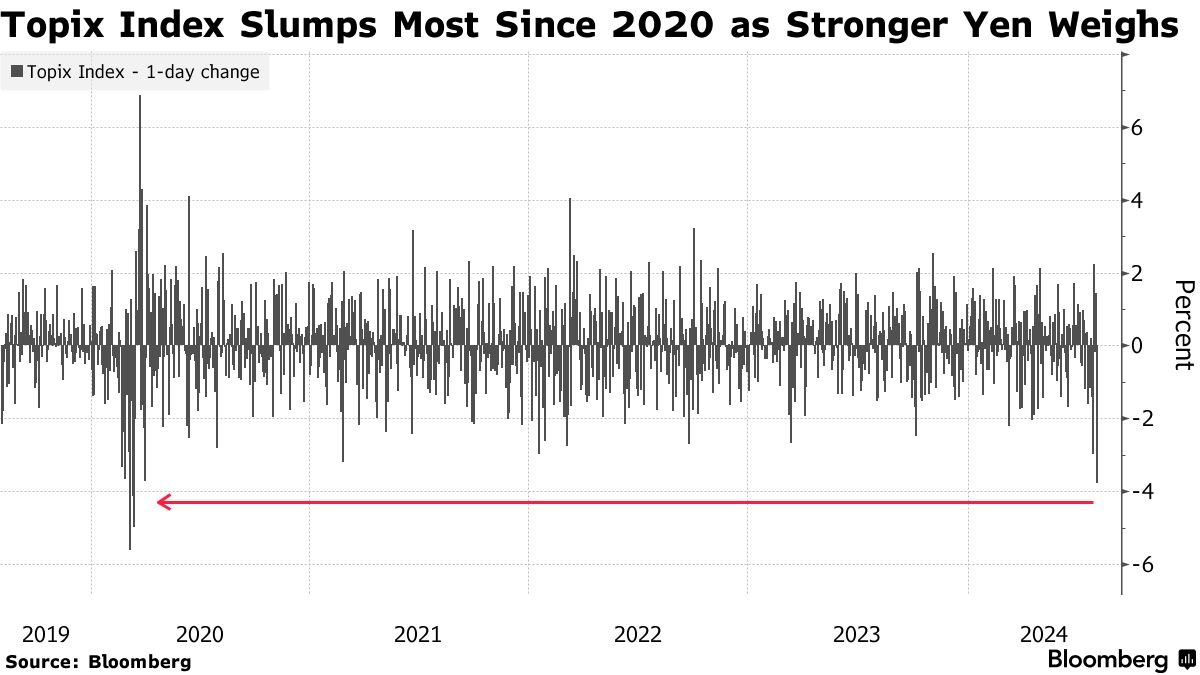 智通财经获悉,由于日本央行周三宣布加息,日元大幅升值令出口商承压,利率上升拖累了房地产类股,日本股市暴跌,东证指数周四出现自2020年4月以来的最大跌幅。东证指数跌幅一度高达3.9%,所有板块均下跌。地产股跌幅高达8.1%,汽车股跌幅为6.4%。因日元贬值而受益于游客消费激增的百货商店股票也出现了下滑。上周进入技术性调整的日经225指数下跌3.5%。