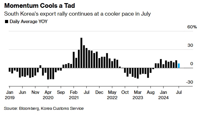 智通财经APP获悉,韩国7月出口增长放缓,表明全球需求在人工智能和科技行业的繁荣推动今年早些时候的增长之后可能正在略微降温。周四公布的数据显示,反映工作日差异的出口量同比增长7.1%,较6月两位数的增幅有所放缓。此外,韩国7月出口同比增长13.9%,弱于市场预期的18.4%;进口则同比增长10.5%,低于市场预期的13.4%;贸易顺差为36.2亿美元,低于市场预期的50亿美元。
