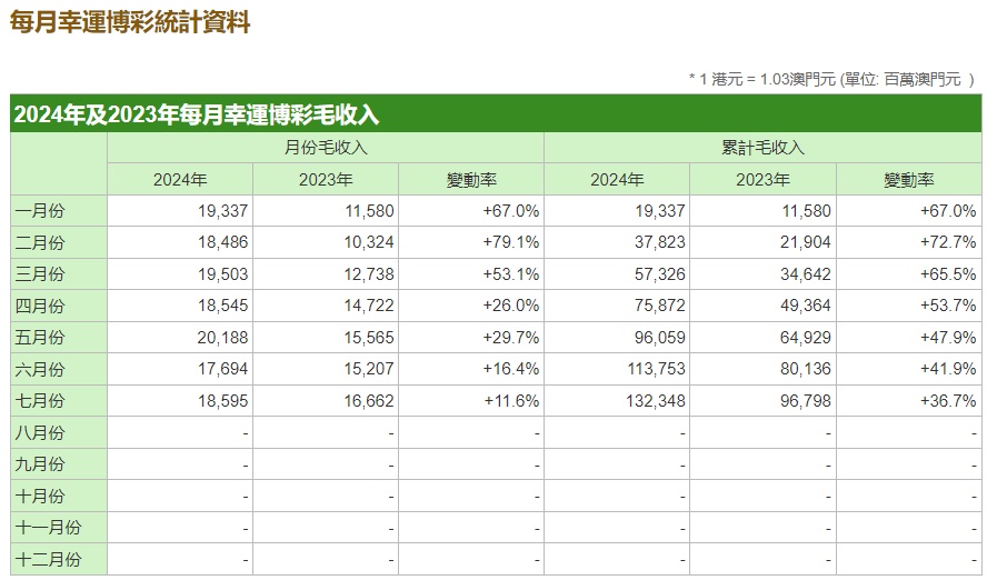 澳门7月幸运博彩毛收入约186亿澳门元 同比增长11.6%