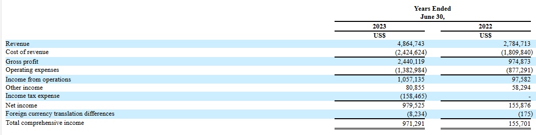 2022财年、2023财年(财政年度截止时间为每年6月30日)和2024财年前六个月(截至2023年12月31日),以下简称(报告期内),盾兵科技的收入分别为278.47万元(单位:美元:下同)、486.47万元和297.19万元,相应的净利润分别为15.59万、97.95万元和 11.34万元。总体来看,公司的业绩增长趋势良好。