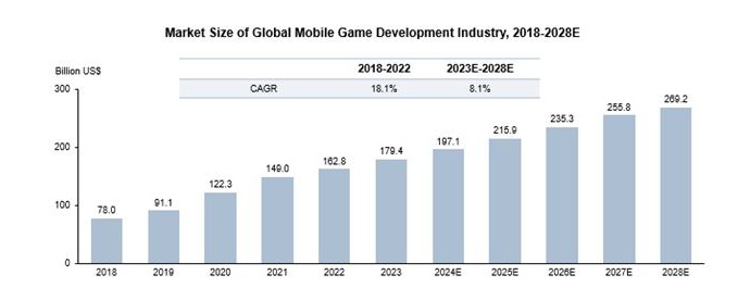 展望未来,在云游戏等关键趋势的推动下,全球移动游戏市场预计将继续强劲增长, AR/VR集成,以及在智能手机使用率迅速增长的发展中地区的进一步地理扩张。随着VR在移动设备上获得更多身临其境的体验,该行业的前景仍然非常强劲。全球移动游戏发展的市场规模从2023年的1794亿美元增长到2028年的2692亿美元,复合年增长率约为8.1%。