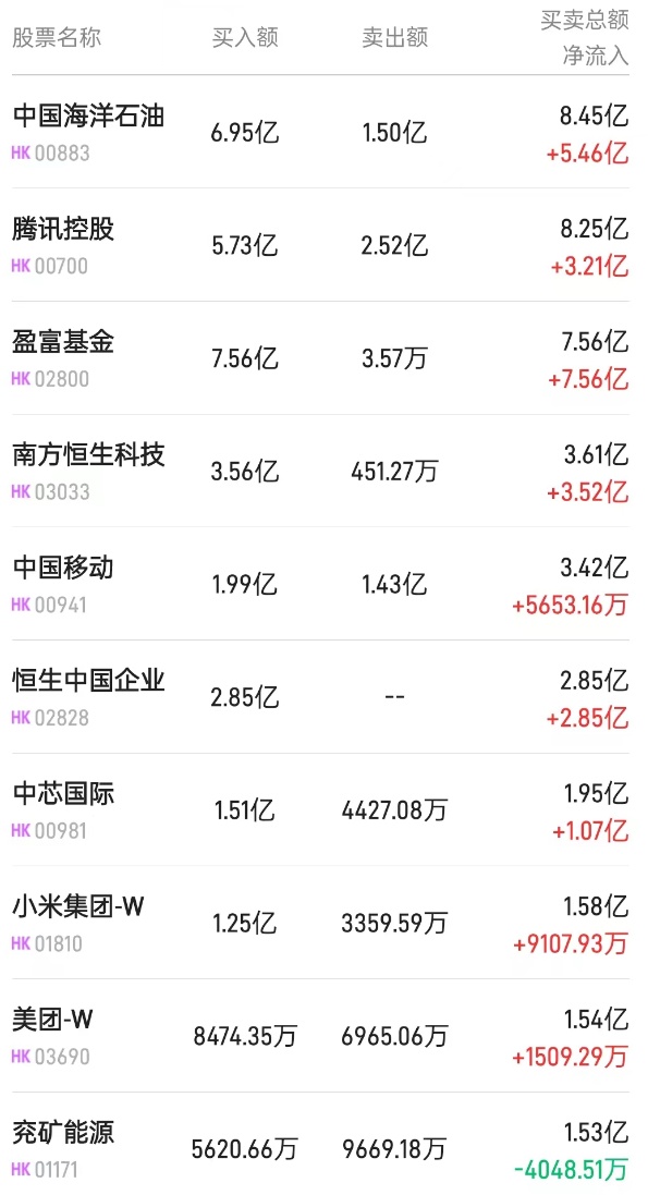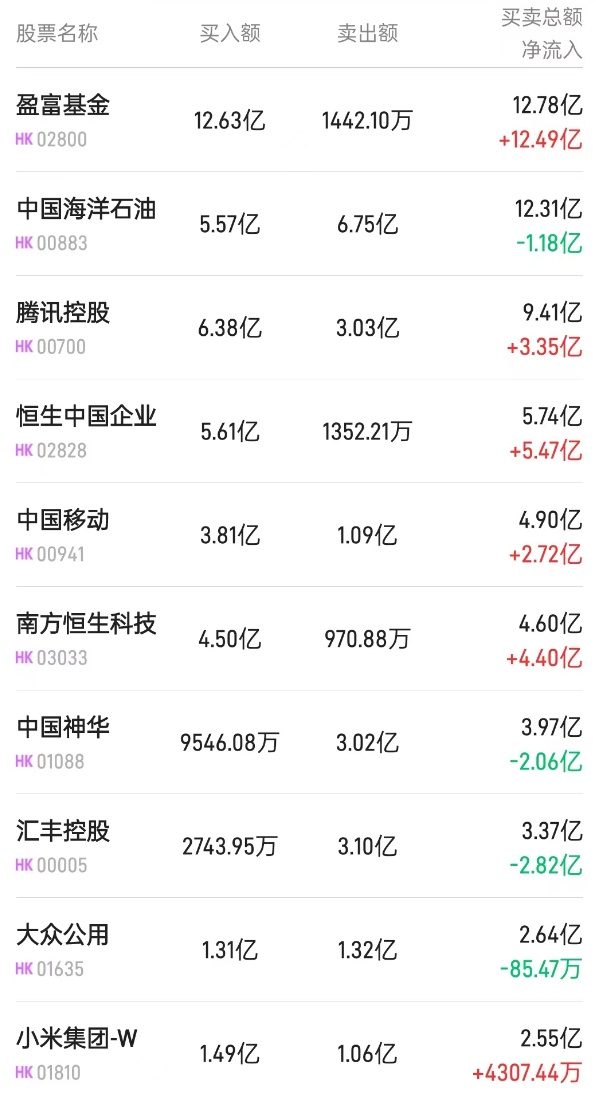 此外,中国移动(00941)、小米集团-W(01810)分别获净买入3.28亿、1.34亿港元。