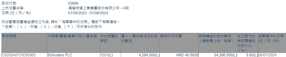 智通财经APP获悉,据香港联交所最新数据显示,7月30日,施罗德减持福耀玻璃(03606)428.4万股,每股作价40.5835港元,总金额约为1.74亿港元。减持后最新持股数目约为3426.6万股,持股比例为5.65%。