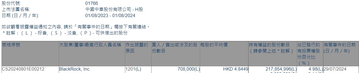 智通财经APP获悉,据香港联交所最新数据显示,7月29日,贝莱德减持中国中车(01766)70.8万股,每股作价4.8449港元,总金额约为343.02万港元。减持后最新持股数目约为2.18亿股,持股比例为4.98%。