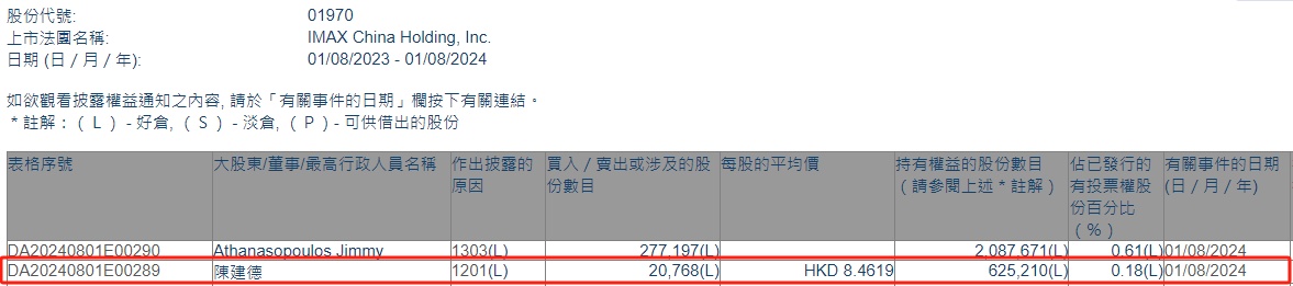 智通财经APP获悉,香港联交所最新资料显示,8月1日,副主席兼执行董事陈建德减持IMAX 中国(01970)2.0768万股,每股作价8.4619港元,总金额约为17.57万港元。减持后最新持股数目约为62.52万股,最新持股比例为0.18%。