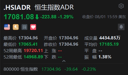 智通财经APP获悉,周四美股三大指数集体下跌,恒生指数ADR下跌,按比例计算,收报17081.08点,较香港收市下跌223.88点或1.29%。