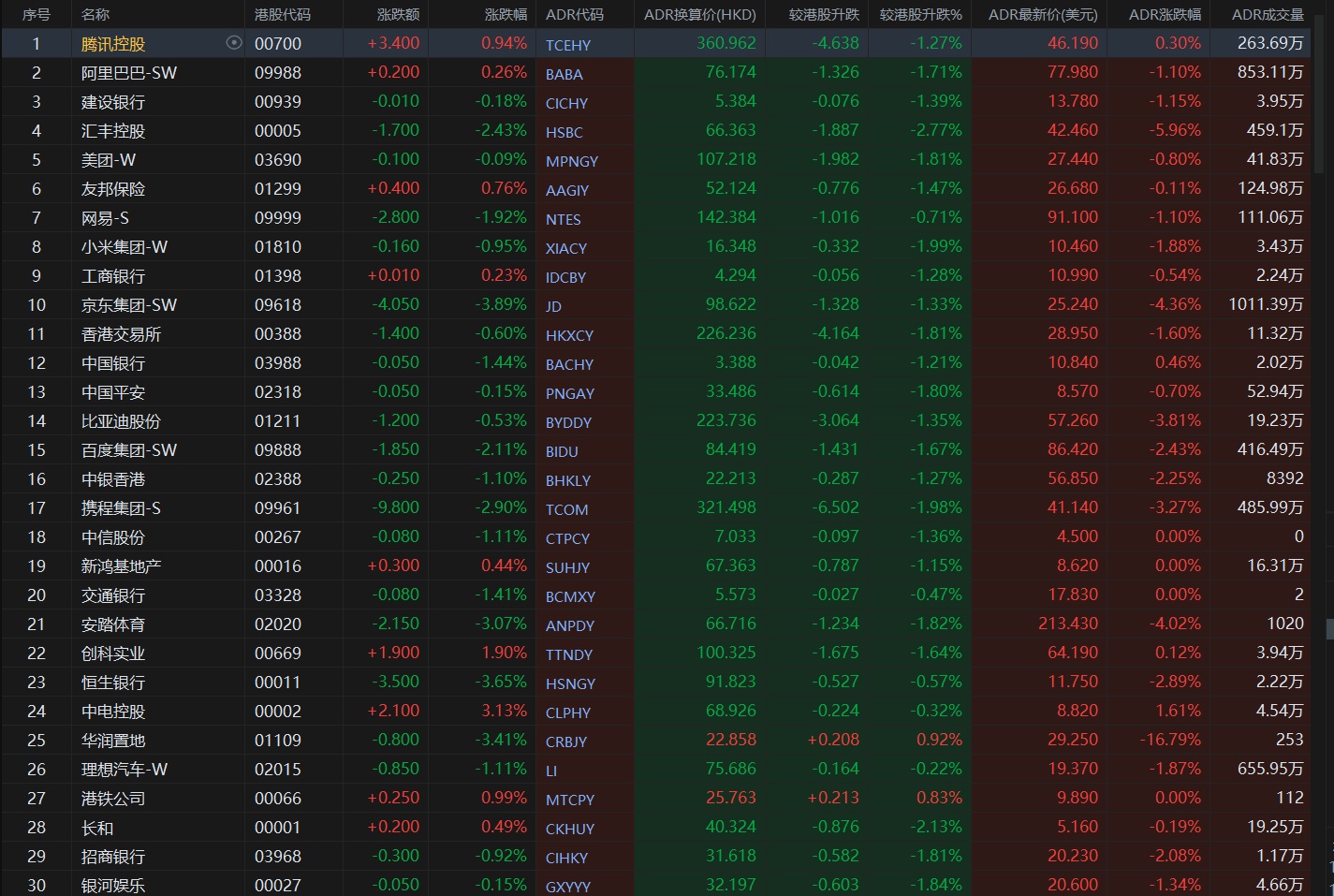 大型蓝筹股近乎全线下跌,汇丰控股收报66.363港元,较香港收市下跌2.77%;腾讯控股收报360.962港元,较香港收市下跌1.27%。