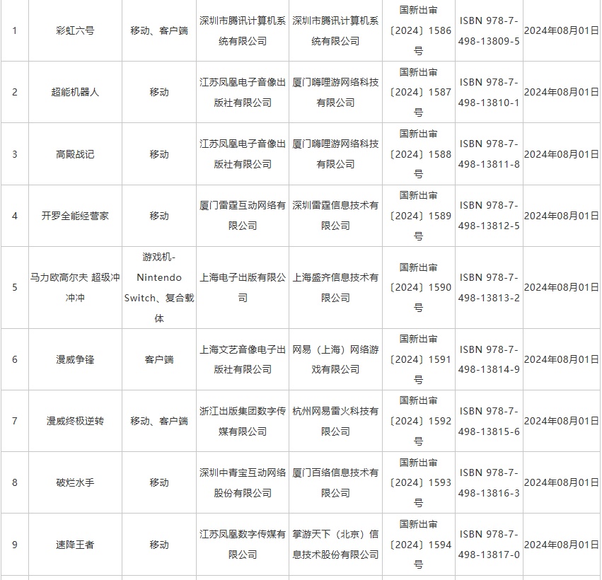 智通财经APP获悉,8月2日,国家新闻出版署发布8月进口网络游戏审批信息,共15款游戏获批,腾讯(00700)《彩虹六号》、网易(09999)《漫威争锋》《漫威终极逆转》等在列。